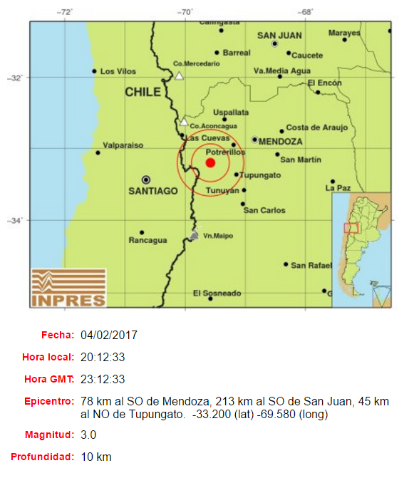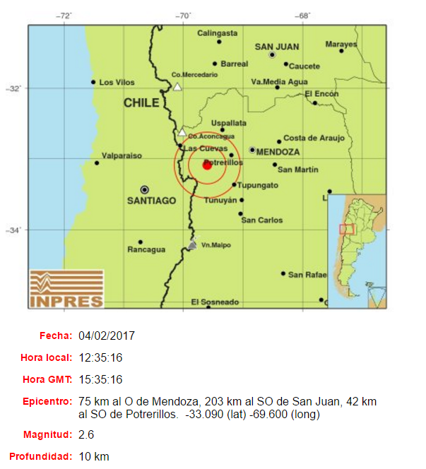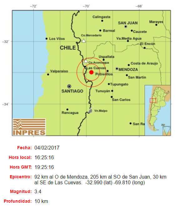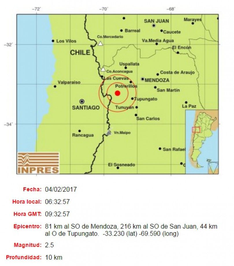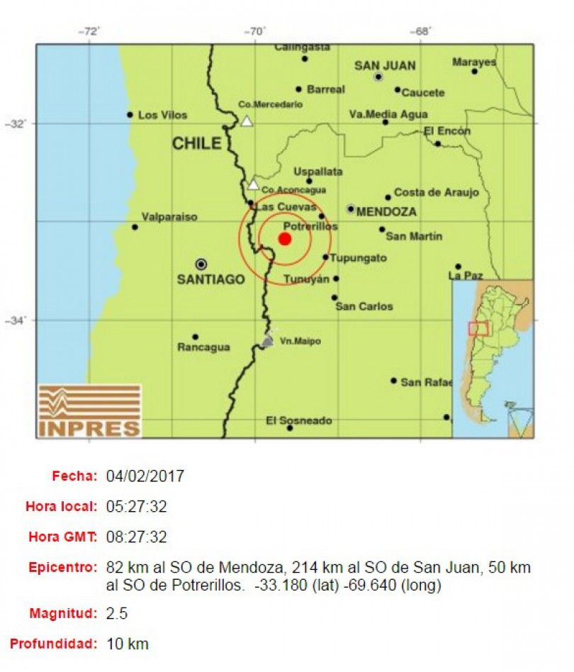 En lo que va de este sábado el piso se movió cinco veces en la provincia: el primero ocurrió a las 5.27, mientras que el segundo se sintió apenas pasadas las 6.30. En ambos casos la intensidad fue baja: 2.5º en la escala de Richter. El tercero fue a las 12.35, con epicentro a 75 kilómetros de la ciudad de Mendoza y a 42 km al sudoeste de Potrerillos. De magnitud 2,6 y de profundidad, sólo 10 kilómetros, según información brindada por INPRES. El penúltimo fue a las 16.25 y de magnitud 3,4. El epicentro se situó a 92 km al oeste de Mendoza y a 30 km al sudeste de Las Cuevas. Y el último, a las 20.12, de magnitud 3 y epicentro a 78 km al SO de Mendoza: