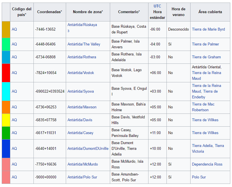 El archivo de la TZ Database zone.tab contiene las siguientes zonas, las columnas marcadas con * contienen datos del archivo de zone.tab