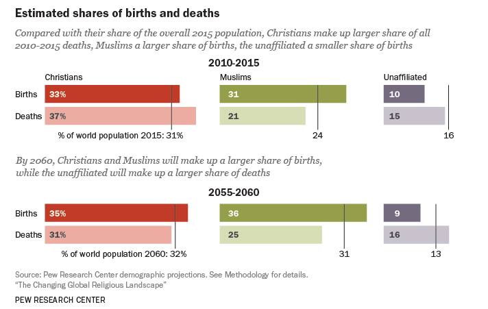 Si bien en los últimos años han nacido más bebés de madres cristianas que cualquier otra religión, refleja al cristianismo como la religión con más seguidores en el mundo, la tendencia cada vez favorece más a la religión musulmana, al punto que se estima que en un poco más de 10 años, quizás por primera vez en la historia, se convierta en la principal religión del mundo, ya que cada vez nacen más hijos de madres musulmanas que de religión cristiana. Así lo indican estudios realizados por Pew Research Center. gación, con sede en Washington, y esto se confirma con un reciente estudio difundido por el mismo instituto: