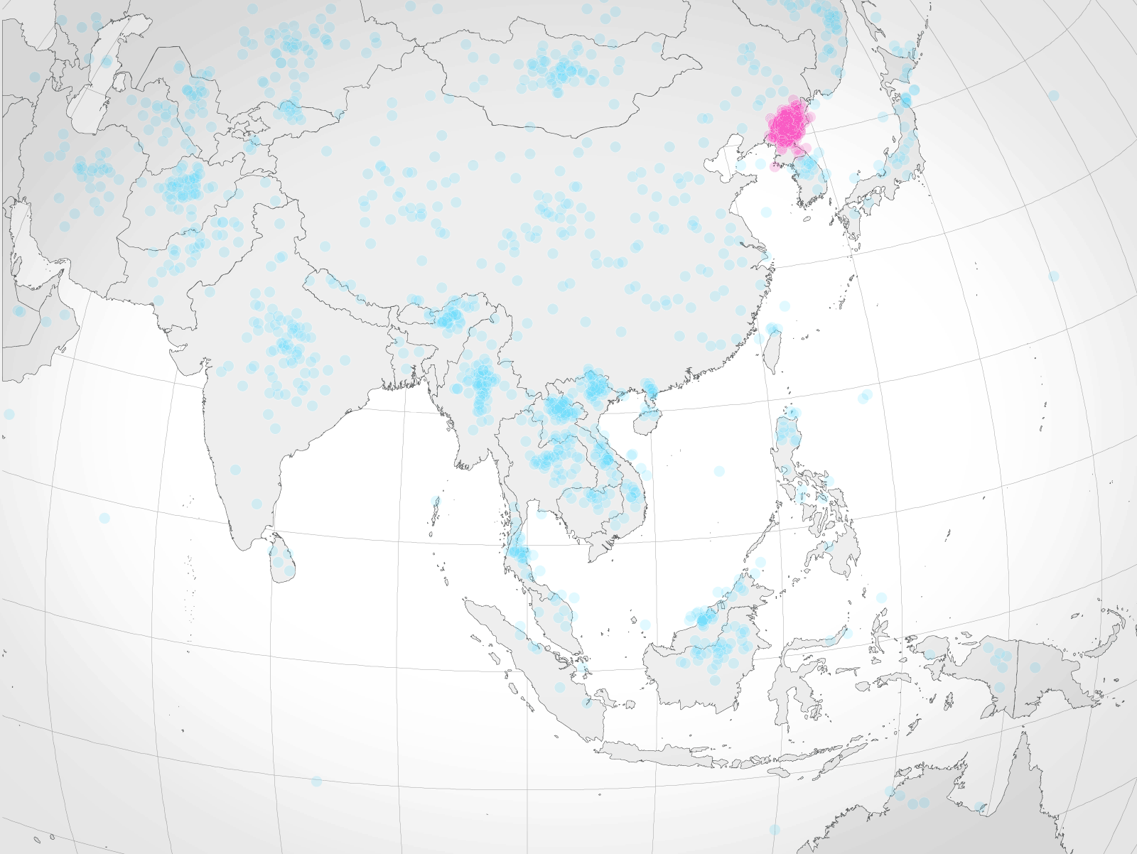 En el mapa puede verse en cada punto celeste se ubica el lugar preciso en el que los encuestados ubicaron a Corea del Norte. Eso sí: se les suministró un mapa de Asia y no un Planisferio, si no probablemente la situación podría haber sido aun peor.
