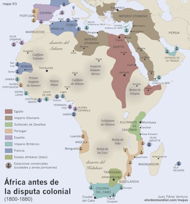 En África predominaban los Estados de origen tribal, pequeños territorios gobernados por monarquías familiares históricas, como los Reinos Mossi. La mayoría de estos Estados desaparecieron conforme avanzaba el S.XIX y llegaban masivamente los colonos europeos. Los antiguos reyes y sultanes africanos fueron reemplazados por gobernadores ingleses y franceses, y los califatos e imperios pasaron a ser productivas colonias. Terminá de leer este informe haciendo clic aquí y en los mapas.