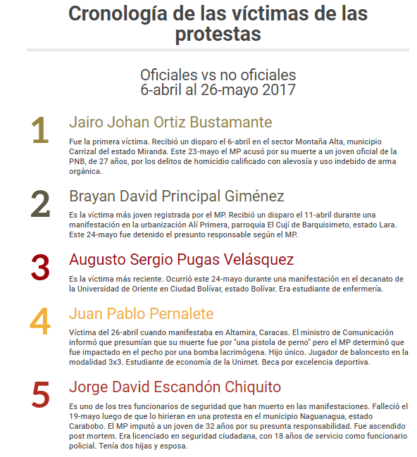 A continuación El Cambur hizo una cronología de las víctimas, donde incluyó las oficializadas por el Ministerio Público y las mencionadas por otros medios de comunicación (nacionales y regionales) así como otras organizaciones civiles. No se mencionan seis casos reseñados por diversas fuentes por considerarse hechos aislados y parte de las estadísticas de criminalidad del país (secuestro, robo y arrollamiento).
