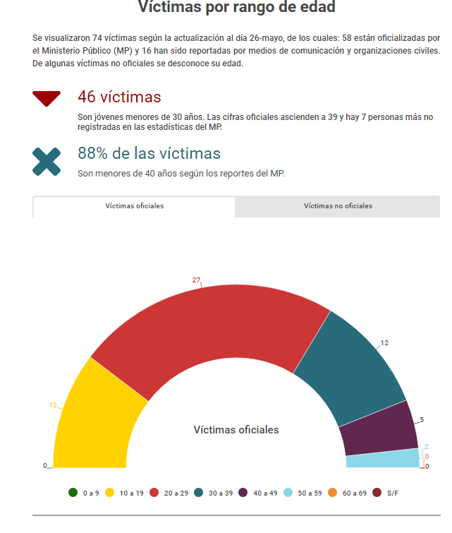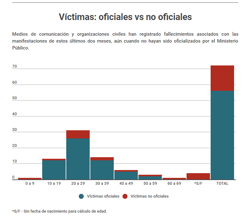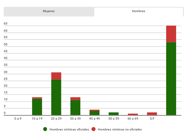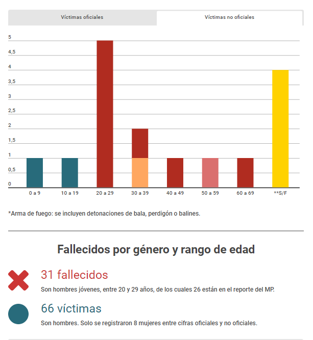 Los datos de las víctimas son alarmantes. De todos los reportados por el Ministerio Público, un 88% son menores de 40 años, el 73% murió por arma de fuego (balas, perdigones o metras) y 92% son hombres. En el caso de los fallecidos no oficiales, la historia no es muy distinta: 56% son menores de 40, al menos el 50% murió por arma de fuego y 75% fueron hombres. Los que más se exponen son hombres, de todos los registros de fallecidos solo hay 8 mujeres.