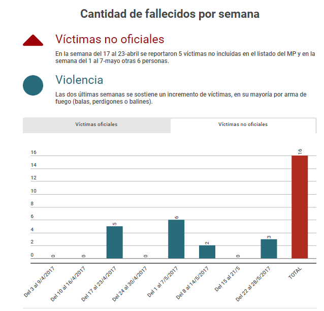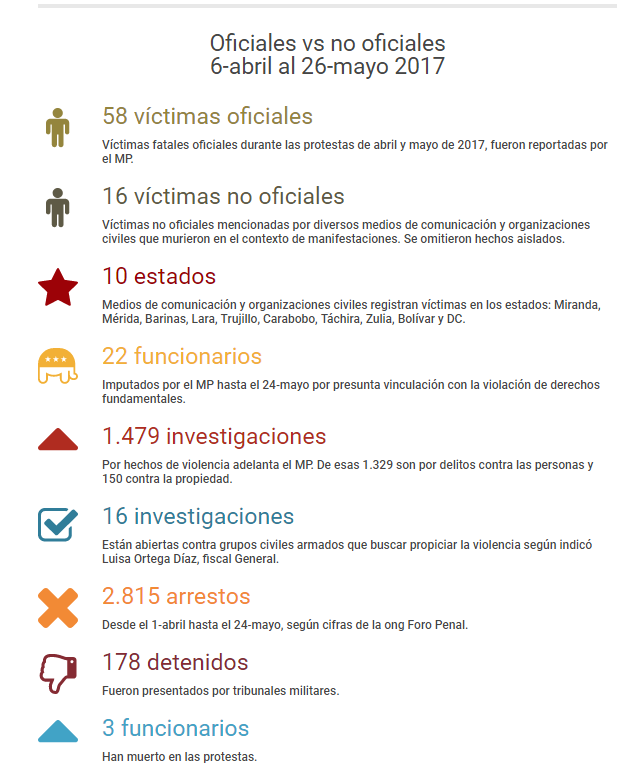 Casi dos meses de protestas y el saldo de víctimas escala cifras cada semana, en su mayoría hombres jóvenes, menores de 30 años. Hasta la fecha, el Ministerio Público ha hecho mención de 58 fallecidos oficiales (desde el 6-abril hasta el 26-mayo) mientras que los medios de comunicación y las organizaciones civiles han reportado más, alrededor de 16 personas. En esta espiral también se incluyen los daños a la propiedad, bienes del Estado y comercios de privados.
