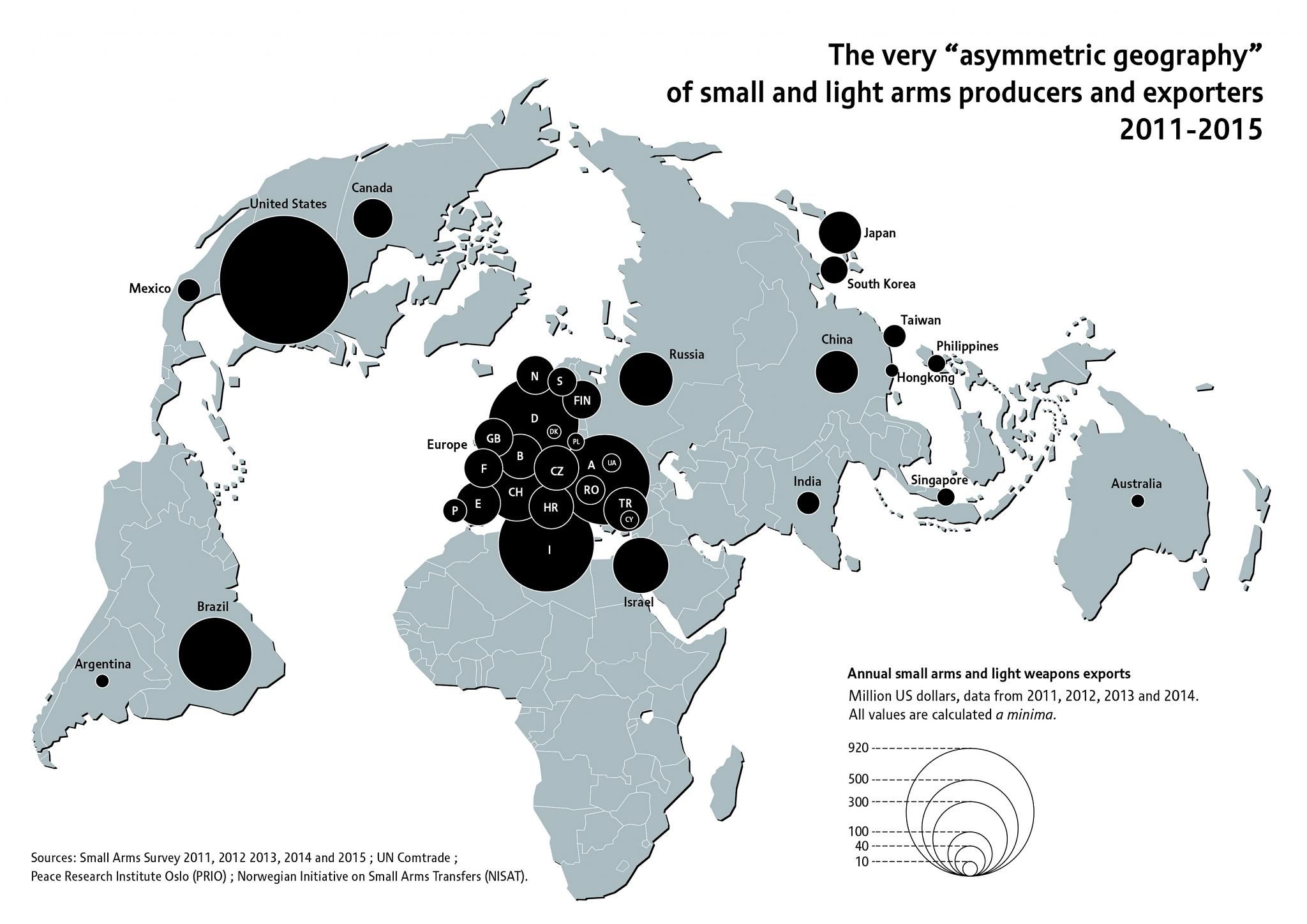 Este es el mapa que diseñó la prestigiosa ONG suiza Small Arms Survey (La encuesta global de armas pequeñas) sobre la producción y exportación de armas técnicamente llamadas "pequeñas y ligeras" (por livianas):