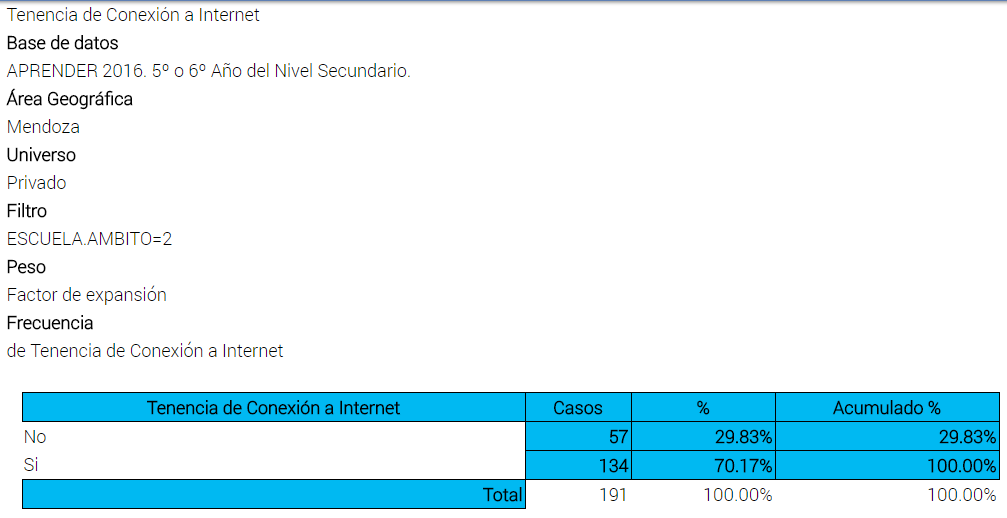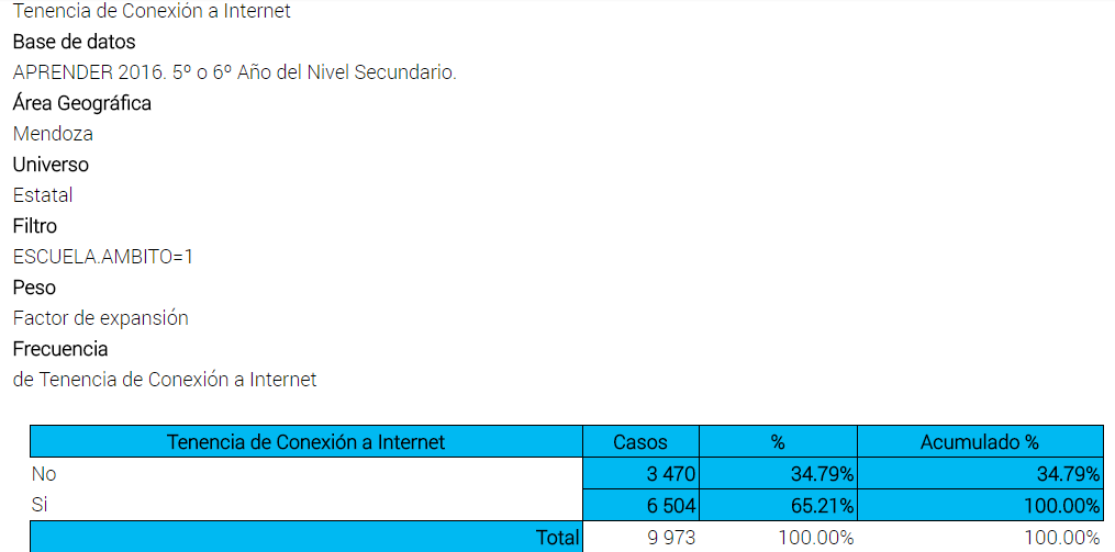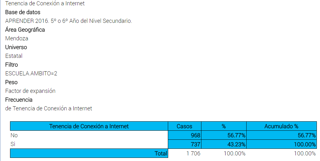 El diagnóstico en Mendoza es el de una brecha en las escuelas rurales, entre los alumnos que asisten a establecimientos públicos y privados: entre 5 y 6 de cada 10 alumnos del último año de la secundaria de las escuelas públicas rurales de la provincia no acceden a internet. Según 1.706 casos analizados en el operativo Aprender 2016, el 56,77% no tiene conexión a internet y el 43,23%, sí.