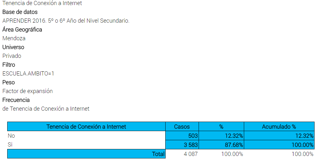 Mientras que en las escuelas privadas y urbanas de la provincia, sobre un total de 4.087 casos analizados, casi 9 de cada 10 estudiantes disponen de internet (87,68% contra 12,322%):