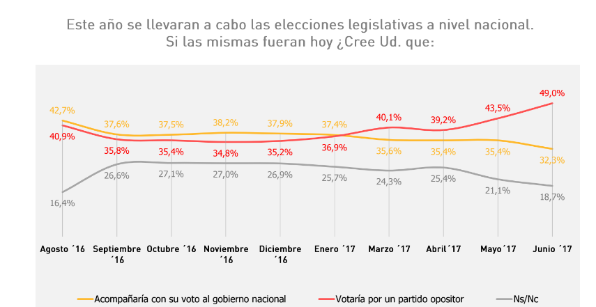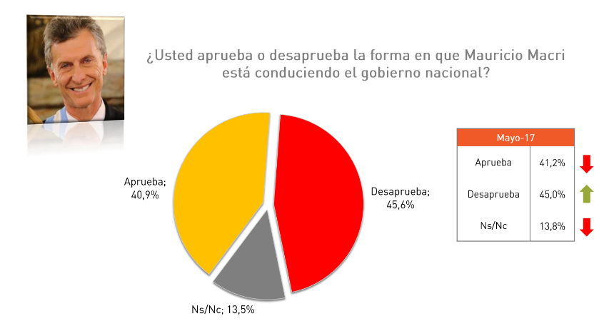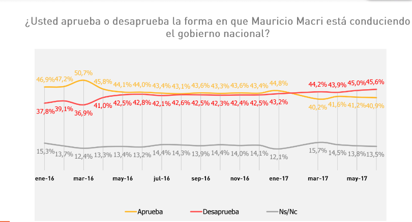 La aprobación de la gestión de Mauricio Macri alcanza al 40,9% mientras que la desaprobación trepa al 45,6%. Los datos fueron relevados durante junio por la encuestadora M&F de MAriel Fornoni y agregan un dato más: el 13,5% de la gente prefirió no contestar. De la lectura del trabajo que se concluyó el pasado 30 de junio surge que crece la desaprobación y baja la cantidad de gente que no está dispuesta a opinar.