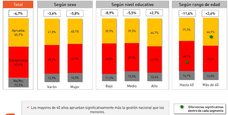 Al analizar quiénes son los que aprueban el rumbo del gobierno, si bien se registran caídas de entre 2,7% (nivel educativo alto) y 11,4% (personas de hasta 40 años), ha aumentado entre los que tienen más de 40 años en un 2,6%):