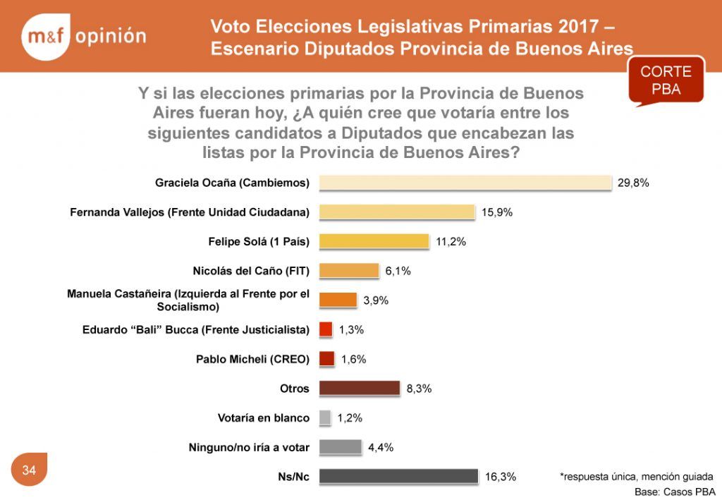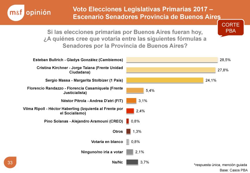 Según la última encuesta de la consultora Management & Fitque fue elaborada para medir entre otras cuestiones la intención de voto de cara a las legislativas 2017, éste sería el escenario si las elecciones primarias fueran hoy.