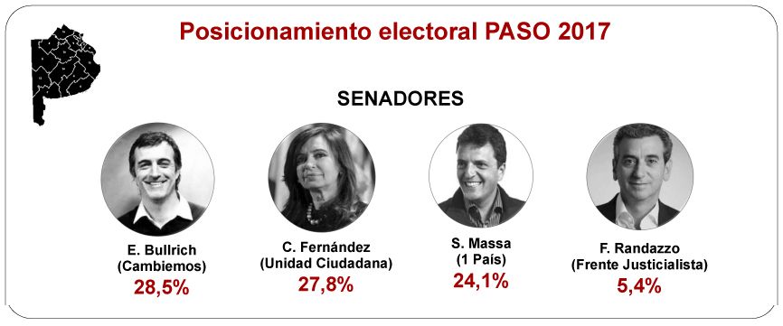 La boleta de Cambiemos con el binomio Esteban Bullrich y Gladys González sería la más elegida en la provincia de Buenos Aires con el 28,5% de los votos. A escasos puntos, en segundo lugar se encuentra la lista de Unidad Ciudadana, que encabezan la ex presidenta Cristina Kirchner y Jorge Taiana, que obtendría el 27,8%. En tanto que la nómina de 1País con Sergio Massa y Margarita Stolbizer ocupa el tercer puesto con el 24,1%. Luego cuarto quedaría el Frente Justicialista de Florencio Randazzo y Florencia Casamiquela, con el 5,4%. Siendo que Néstor Pitrola y Andrea D´Atri del FIT quedarían quintos con el 3,1%, Vilma Ripoll y Héctor Haberling de Izquierda al Frente por el Socialismo con 2,4% irían sextos y Pino Solanas con el 0,8% de los votos séptimos.
