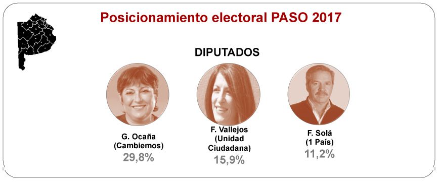 En la categoría de diputados nacionales por la Provincia, ganaría Cambiemos, con Graciela Ocaña a la cabeza, que sería elegida por el 29,8% de los votos. En segundo puesto se encuentra Fernanda Vallejos de Unidad Ciudadana con el 15,9%. Luego se ubica el actual diputado nacional y ex gobernador bonaerense, Felipe Solá, de 1País que se quedaría con el 11,2% de los votos. Más abajo aparece el candidato del Frente Justicialista, el intendente de Bolívar, Eduardo Bali Bucca, con el 1.3%. Antes de él se ubican: opciones de la izquierda que juntos suman 10 puntos, esto es Nicolás del Caño (6.1) y Manuela Castañeira (3.9) y Creo con Pablo Micheli con el 1.6%.