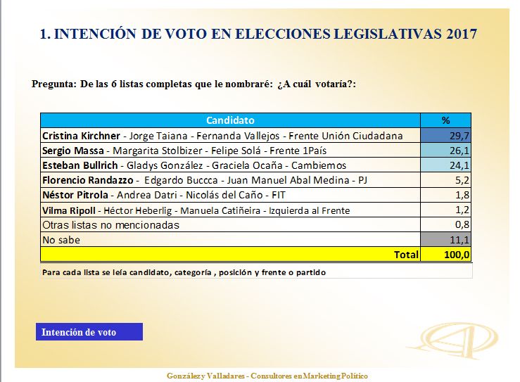 Por su parte, la encuesta de González y Valladares -que midió de modo unificado las listas con cabezas de candidatos para las categorías de senador nacional y diputado nacional en conjunto - la encabeza Unidad Ciudad con candidatos como CFK, Jorge Taiana y Fernanda Vallejos con el 29.7, la sigue 1País con Sergio Massa, margarita Stolbizer y Felipe Solá con el 26.1, tercero se encuentra Cambiemos con Esteban Bullrich, Gladys González y Graciela Ocaña con el 24.1 %, en cuarta posición están con el 5.25% Florencio Randazzo, Eduardo Bucca y Abal Medina, en quinto FIT Pitrola-Datri-Del Caño con 1.8 y luego Izquierda Ripoll-Heberlig-Castañeira al frente con el 1.2%.