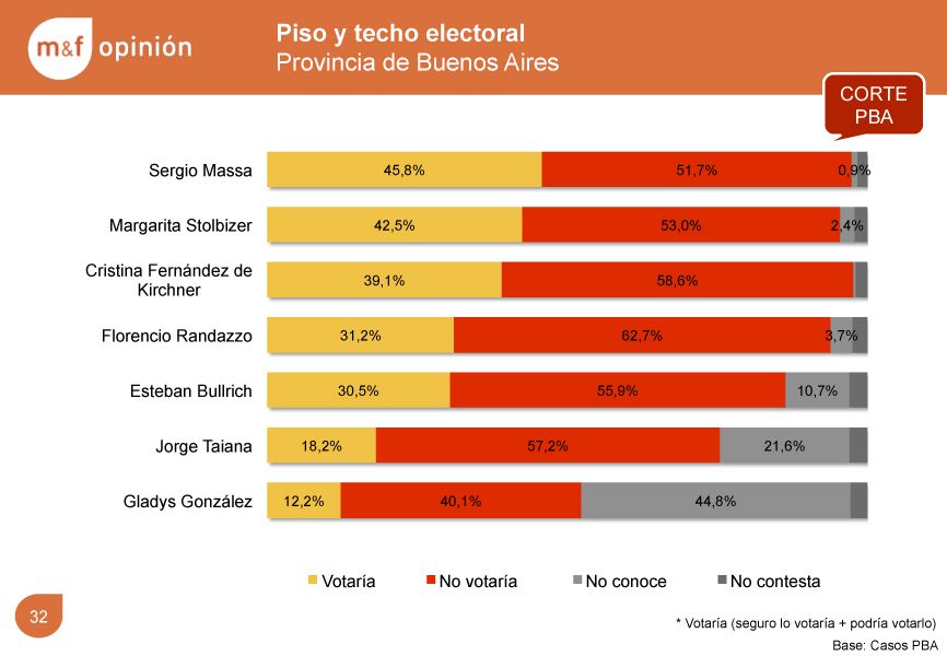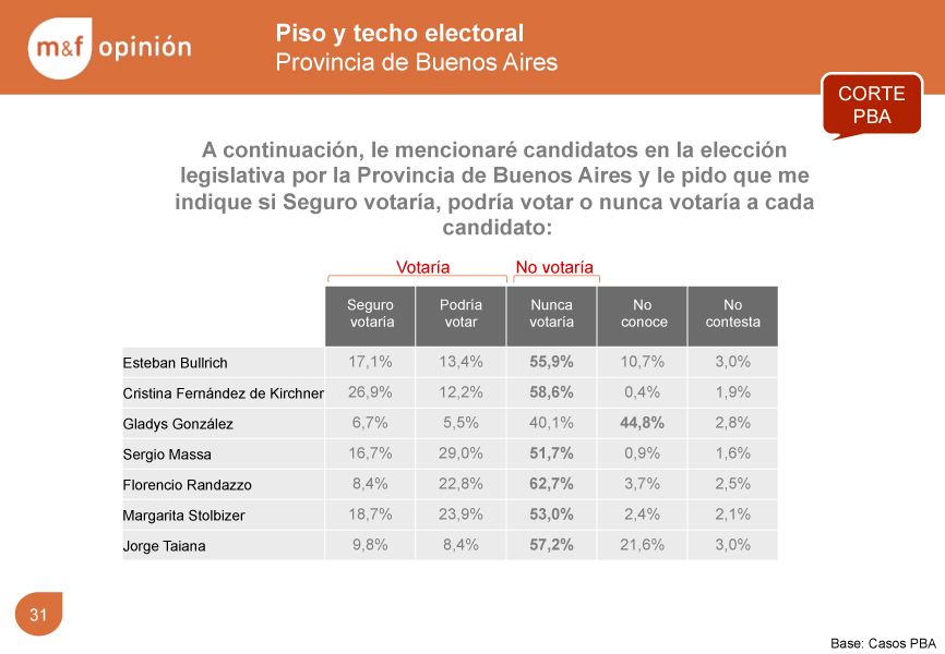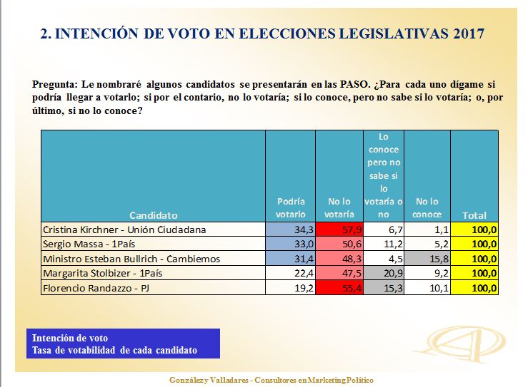 En tanto que para González y Valladares encabeza el ranking de intención de voto Cristina Fernández a quien la votaría el 34.3% y no la votaría el 57.9%, la sigue Sergio Massa a quien lo votaría el 33% y no lo votaría el 50.6%, a Esteban Bullrich lo votaría el 31.4% y no lo votaría el 48.3%, a Margarita Stolbizer la votaría el 22.4% y no la votaría el 47.5%, a Florencio Randazzo lo votaría el 19.2% y no lo votaría el 55.4%.