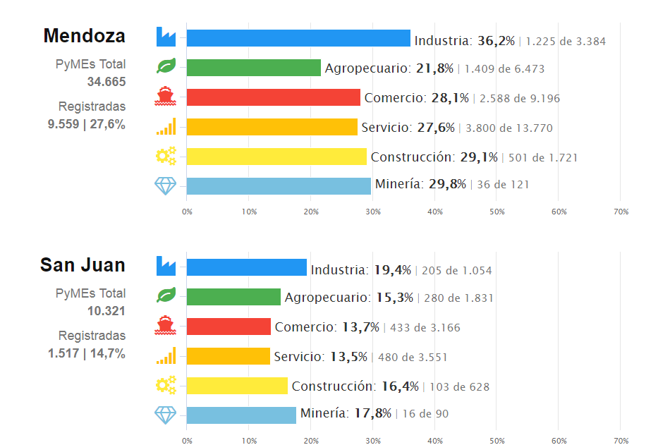 Mendoza triplica a San Juan en cantidad de pymes (34.665 contra 10.321) y casi quintuplica a las de San Luis (7.204 PyMes en la vecina provincia). De las 34.665 PyMEs de la provincia, sólo 9.559 (27,6%) están registradas.