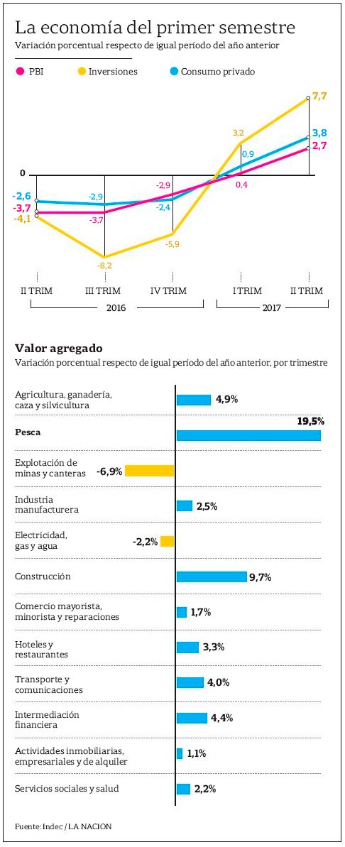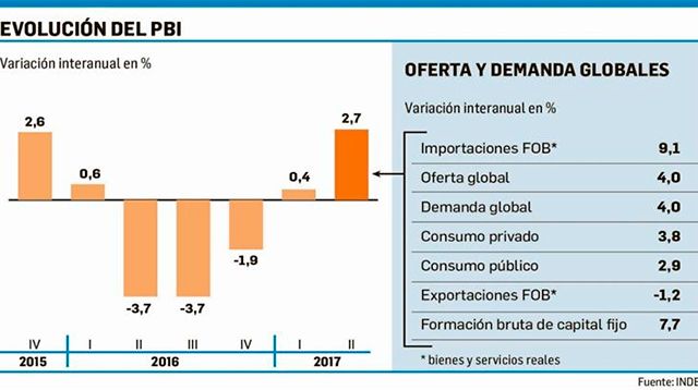 La Nación, por su parte, agenda que el crecimiento de la economía "se consolida, pese a que aún está en niveles inferiores al pico que registró en 2015". Página y Ámbito señalan que "la base de comparación es muy baja", ya que en el segundo trimestre de 2016 la economía había retrocedido un 3,7%. Según El Cronista, la construcción fue el sector que "empujó el crecimiento".