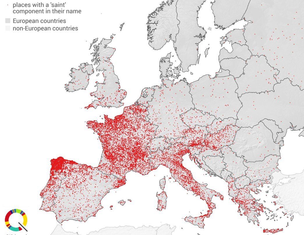 El mapa de los municipios de Europa que se llaman "San" o "Santa"