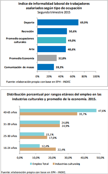 Los más grandes, perjudicados. En comparación con el resto de las actividades, la industria cultural se destaca por un elevado promedio de trabajadores desde los 16 hasta los 31 años. La situación se equilibra entre los 31 a 39 años, en cambio, entre los 40 y 65 años, mientras que en el empleo total el 47,6% son personas de esa edad, en el segmento de las industrias culturales los son el 35,7%.