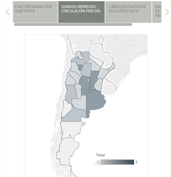 Haciendo clic en la imagen ingresá a la visualización de datos para ver el mapa y comparar, provincia por provincia, la cantidad de libros editados, las entradas de cine por habitante, la circulación de diarios impresos y el empleo registrado en la TV, radio, cine y edición: