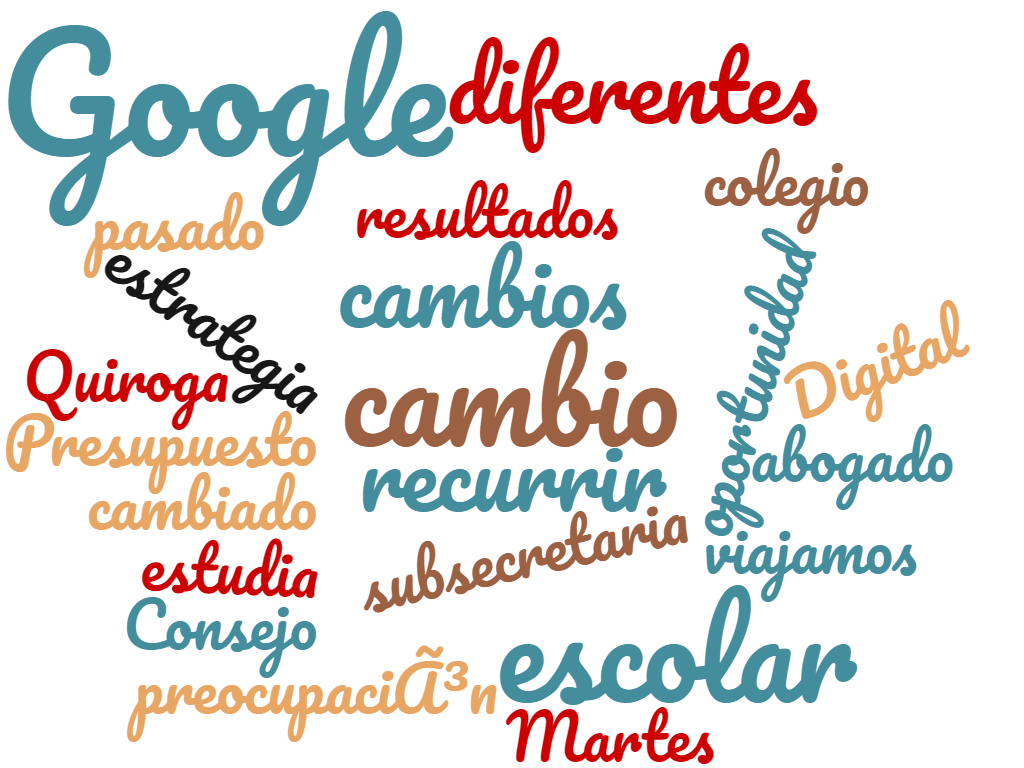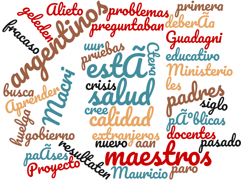 ¿Qué son estas palabras sueltas? Lo que sale en Google al ingresar los términos "educación argentina" (tercera imagen, la de más abajo), "educación perú" (imagen del medio) y "educación chile" (primera imagen, de arriba para abajo). Las palabras fracaso y crisis aparecen solo en la última nube de palabras, la que corresponde a la Argentina.