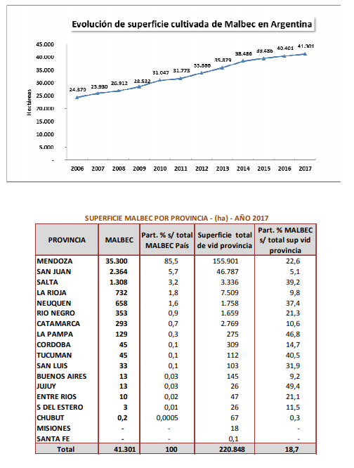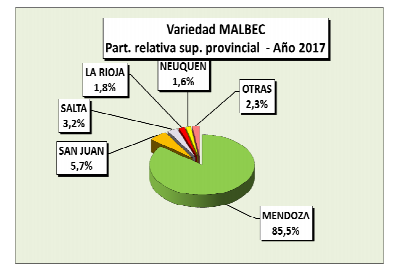 La provincia de Mendoza tiene la mayor cantidad de Malbec del país, alcanzando en 2017 las 35.300 ha (85,5%), seguida por San Juan con 2.364 ha (5,7%) y el resto de las provincias con 3.636 ha (8,8%).