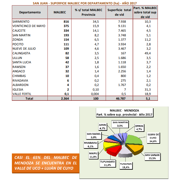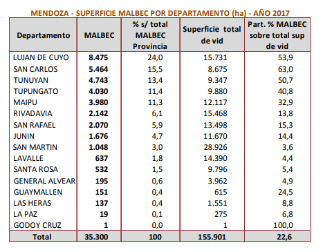 En la provincia de Mendoza la mayor superficie de Malbec se encuentra en los Departamentos de Lujan de Cuyo (24%), San Carlos (15,5%), seguidos por Tunuyán, Tupungato y Maipú. Los tres departamentos del Valle de Uco (San Carlos, Tunuyán y Tupungato) totalizan el 40,3% del Malbec de la provincia.
