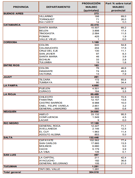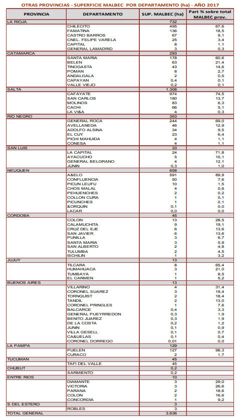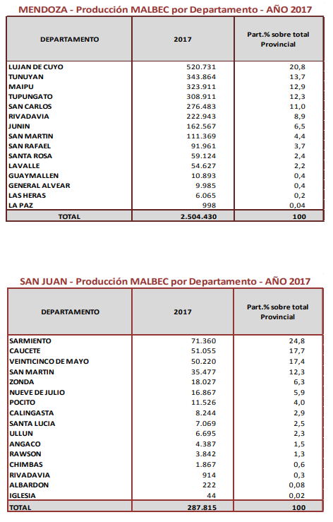 La producción de Malbec 2017 por departamento de origen en cada provincia se muestra en los siguientes cuadros.