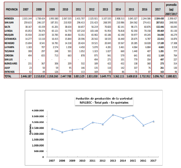 La producción total en el país de la variedad Malbec en 2017 fue de 3.096.762 quintales. Como se puede observar en el siguiente gráfico, la misma va en aumento a lo largo de los años, a excepción del año 2016 en el cual hubo a nivel país una merca de producción general. En 2017 la producción de uva se recuperó y la variedad Malbec aumentó un 13,3% con relación al año anterior.