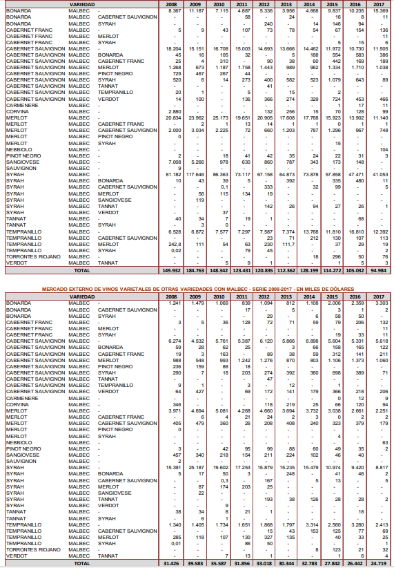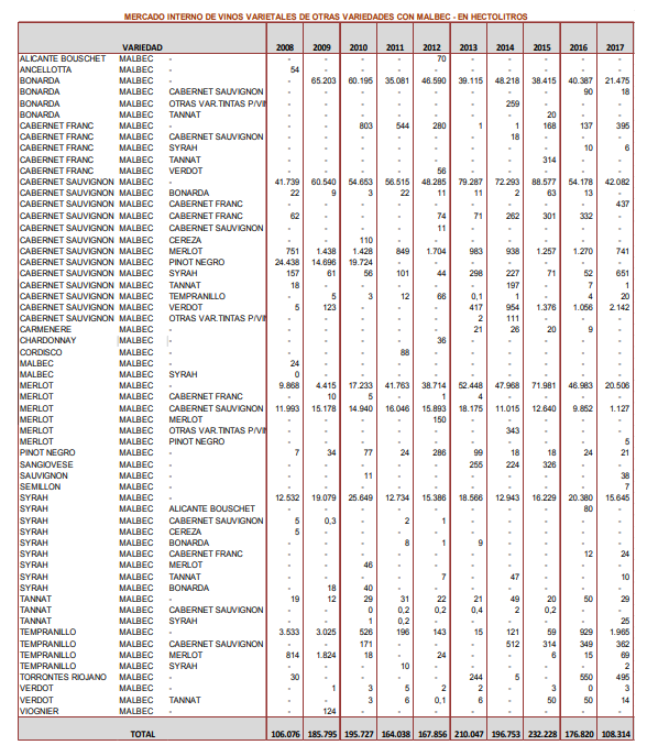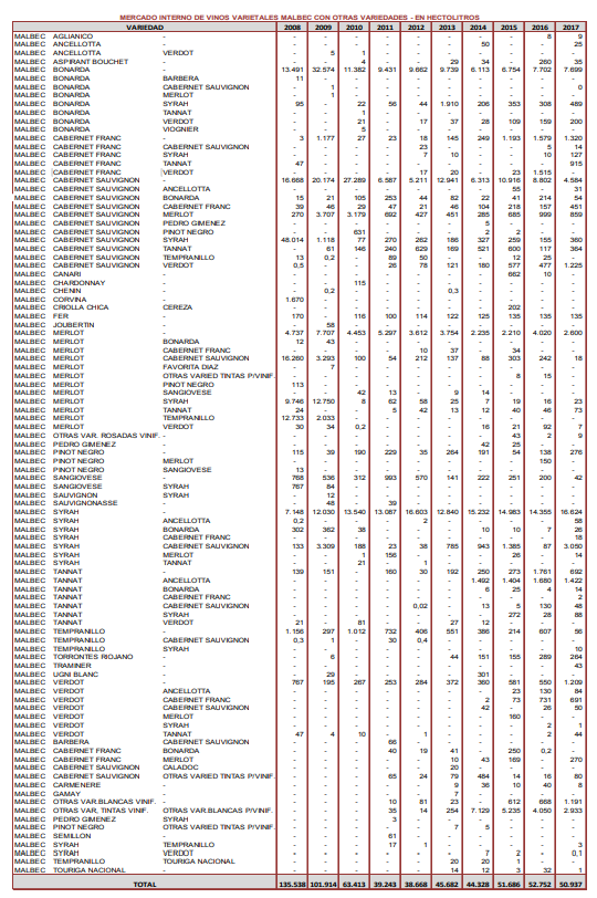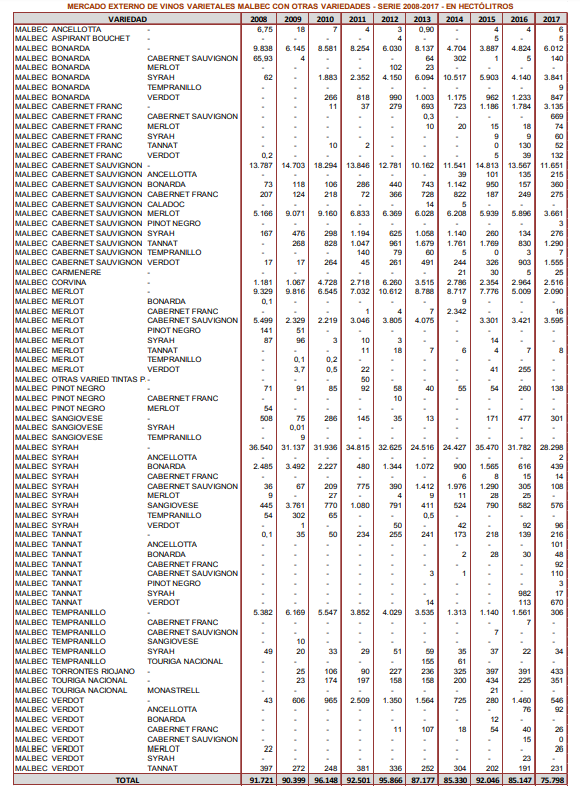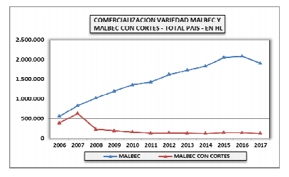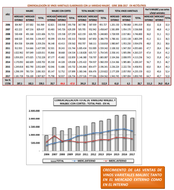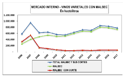 En el año 2017 se comercializaron 777.036 hl de vinos varietales elaborados con Malbec. El 93% corresponde a varietal puro y el 7% a cortes con otra variedad.