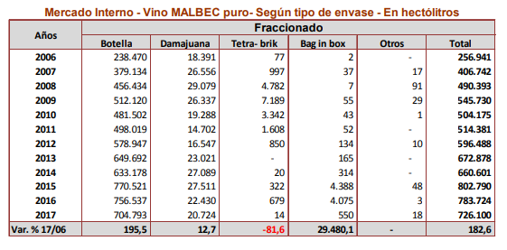 Las ventas al mercado interno de vinos con Malbec han ido en aumento en los últimos años, mostrando en el año 2017 un incremento del 32% respecto al año 2006.
