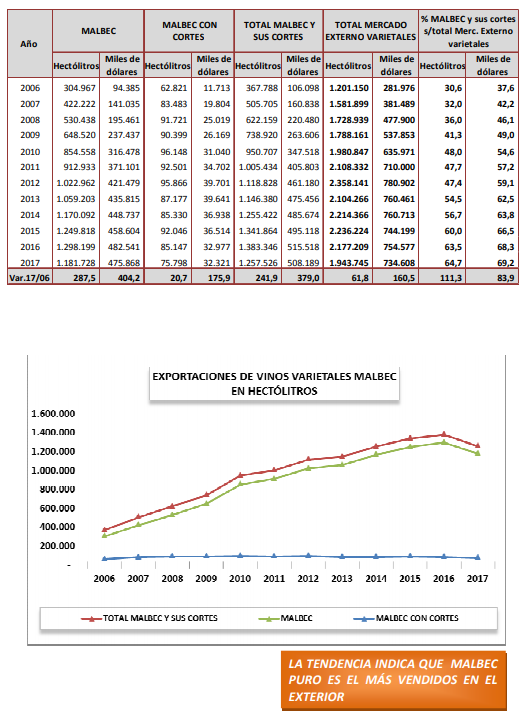 La participación de vinos Malbec y sus cortes en el volumen total de varietales exportados ha aumentado desde 2006. En ese año representaron el 31%, mientras que en 2017 alcanzaron el 65%. Respecto a los cortes, se observa que los varietales puros de Malbec son los que más han aumentado en el mercado externo. Se comercializó en 2017, un 288% más de hectólitros que en el 2006, mientras que el aumento de los varietales de Malbec en cortes con otras variedades aumentó un 21% en el mismo período.