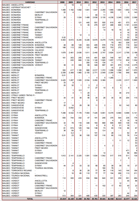 La cantidad de hectáreas de Malbec en todo el país se ha incrementado un 69,4% en el período 2006-2017.
