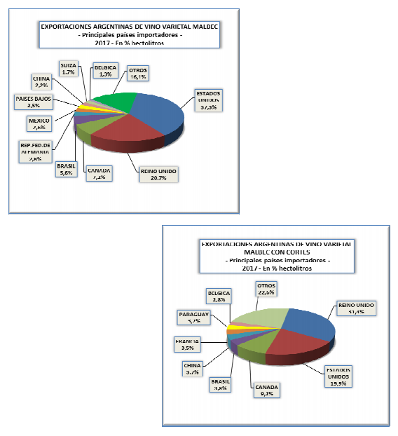 El principal destino de los vinos varietales puros Malbec en 2017 fue Estados Unidos, seguido por Reino Unido. En menor importancia figuran Canadá, Brasil y Alemania. Mientras que para el Malbec con cortes los principales destinatarios fueron Reino Unido, Canadá, Brasil y China.