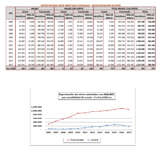 El 85% del total de vinos varietales exportados en 2017 producidos con variedad Malbec fueron fraccionados. Tanto el granel como el fraccionado han aumentado sus ventas en el mercado externo desde el año 2006.