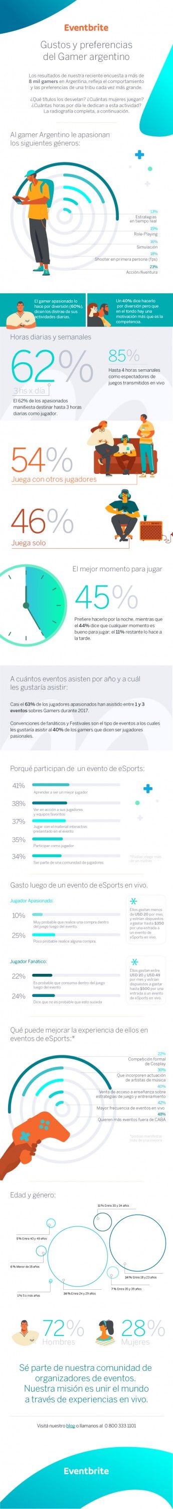 Pero la actividad gamer no se reduce solo a pasar horas a sola detrás de una pantalla, sino también a participar de los eventos eSports, tal como se llaman a las competencias de videojuegos multijugador donde asisten miles de personas y pueden organizarse en importantes estadios. Para el 41% de los gamers encuestados, esos eventos son la oportunidad ideal para aprender a ser un mejor jugador, mientras que un 38% los aprovecha para ver en acción a sus jugadores y equipos favoritos. También hay quienes buscan en estos eventos jugar con el material interactivo presentado (37%) y ser parte de una comunidad de jugadores (34%). Esto demuestra la importancia que tiene para el gamer el perfeccionamiento de sus destrezas y el sentido de pertenencia que le otorgan a la actividad.