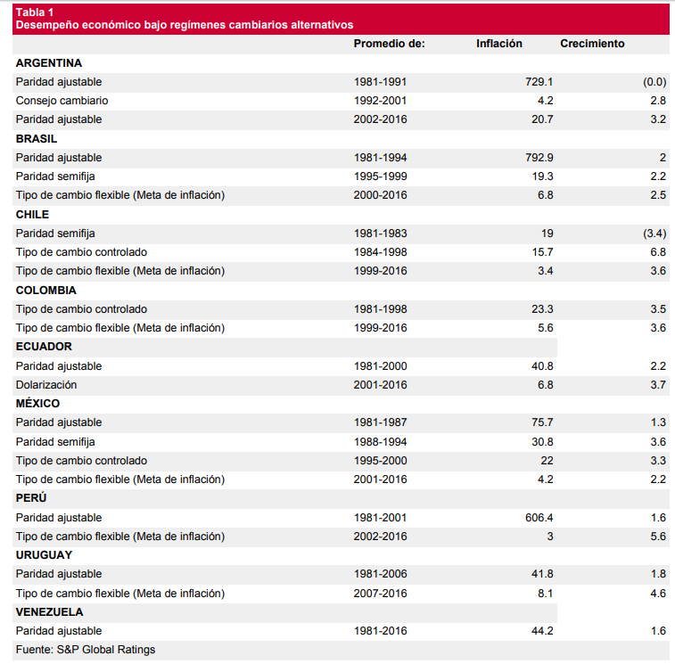 Si bien en la última semana empezó a mostrar debilidades tras el leve aumento del dólar, que llevó al presidente Macri a pedir un préstamos al FMI, a largo plazo ha resultado efectivo en los países de la región donde se ha aplicado, como lo muestra el siguiente cuadro comparativo de S&P Global Ratings: