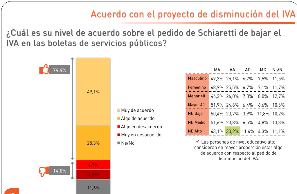 - La disminución del IVA es apoyada por el 74,4% de los encuestados en todo el país y la rechaza el 14%.