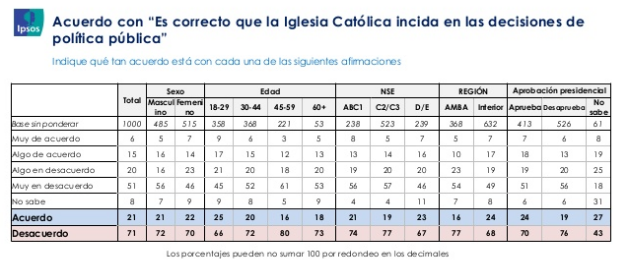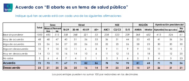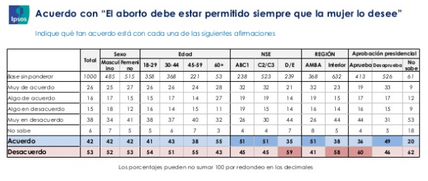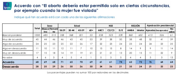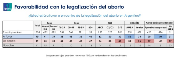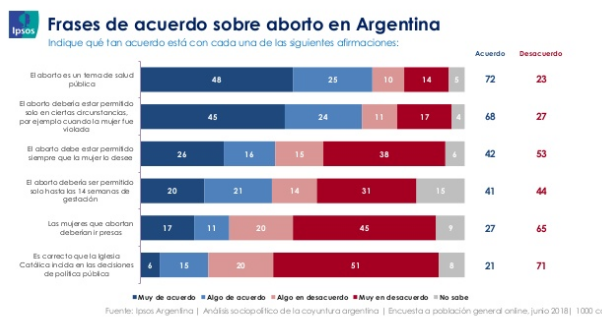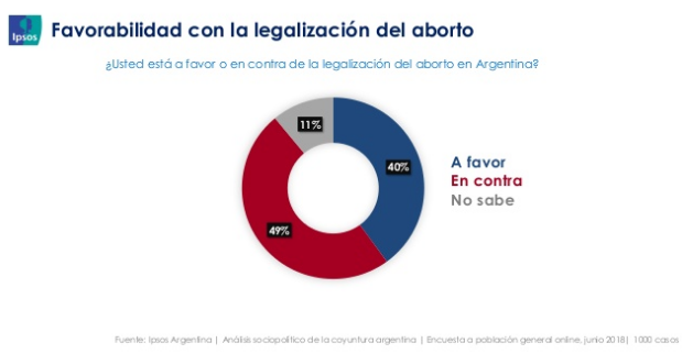Una encuesta sobre mil casos hecha por la consultora Ipsos da como resultado un predominio por 9 puntos de diferencia a favor del rechazo al aborto libre, legal y gratuito en Argentina por sobre la segunda opcion, que es el respaldo a la iniciativa con media sanción en Diputados.