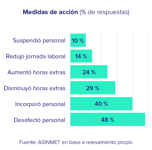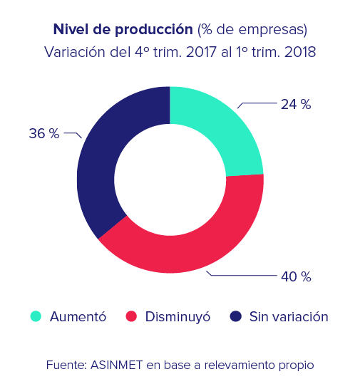Hoy, Asinmet presenta el primer informe, correspondiente al primer trimestre de este año en relación al último trimestre del 2017. Según el informe de "Monitoreo Continuo de Variables del Sector Metalmecánico de Mendoza", de las 42 empresas consultadas, 40% afirma que disminuyó su actividad; el 48% indicó que desafectó personal; 38% afirmó haberse endeudado, y de ese porcentaje, 31,6% lo hizo para pagar impuestos o servicios.