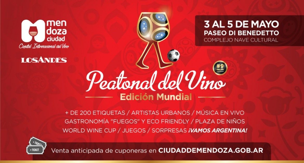Ciudad de Mendoza, Capital Internacional del Vino, presenta la novena edición de la única Peatonal del Vino de la República Argentina "Edición Mundial" el 3, 4 y 5 de mayo de 20 a 01 horas en el nuevo Paseo Di Benedetto.