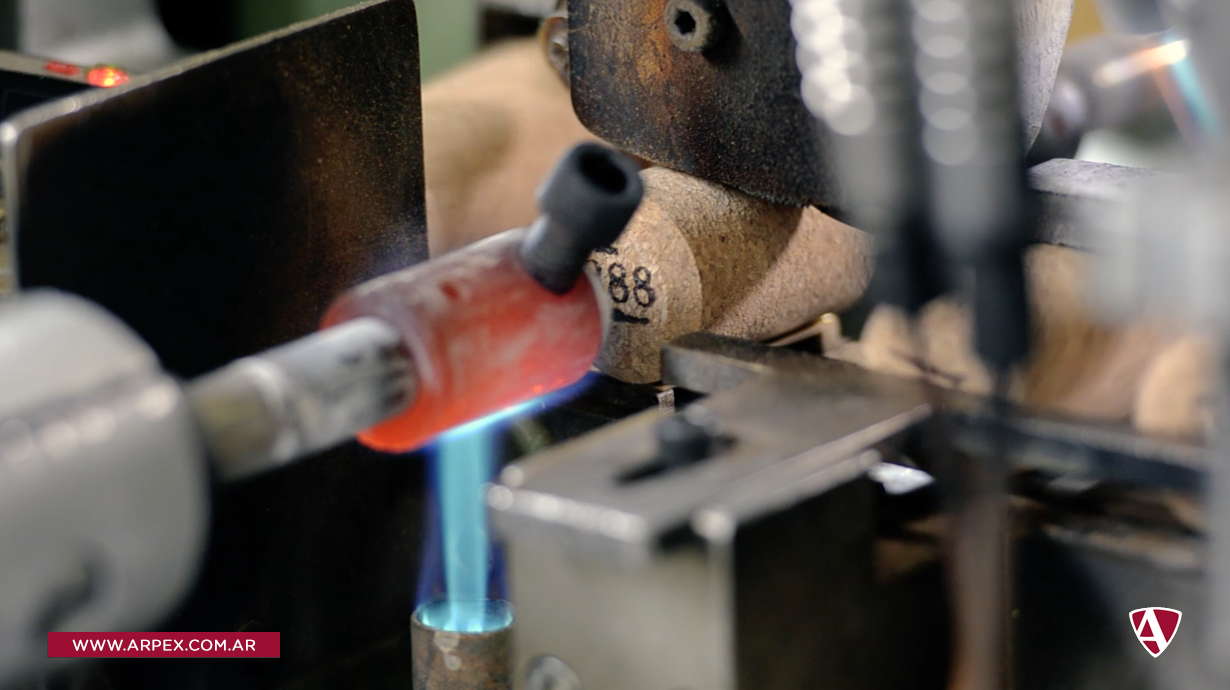 El marcado a fuego, utiliza un cuño con el diseño que es calentado e impreso en el corcho, tanto en el cuerpo como en las cabezas.
