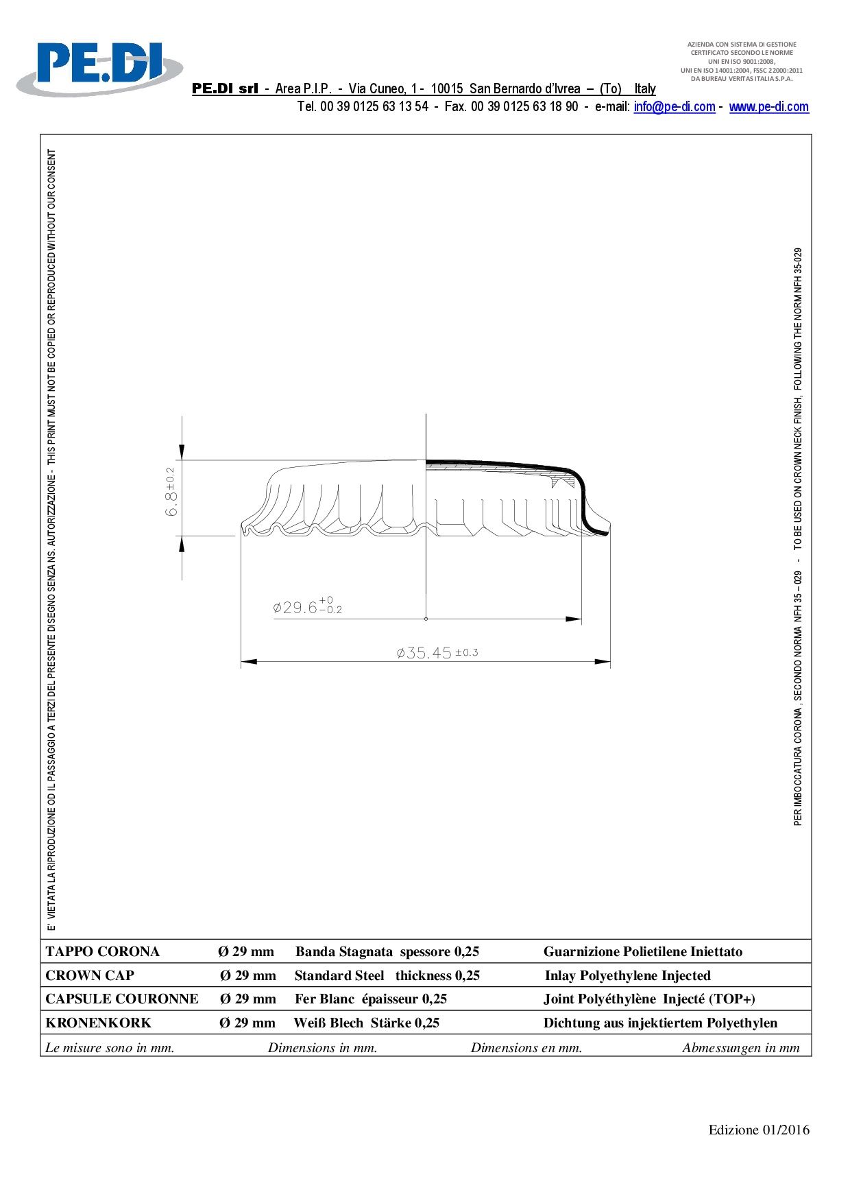 Esta es una ficha técnica estándar de una tapa corona que entregan los proveedores:
