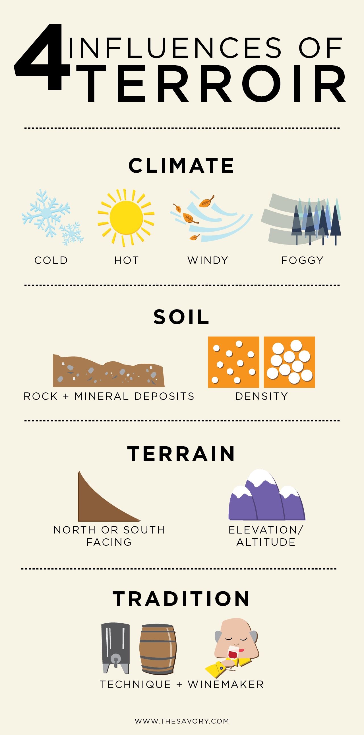 Esta palabra de origen francés (terruño al español) se refiere a las particularidades de una zona geográfica delimitada, con factores que combinan la naturaleza y el trabajo del hombre, y que se diferencian de la siguiente manera:
