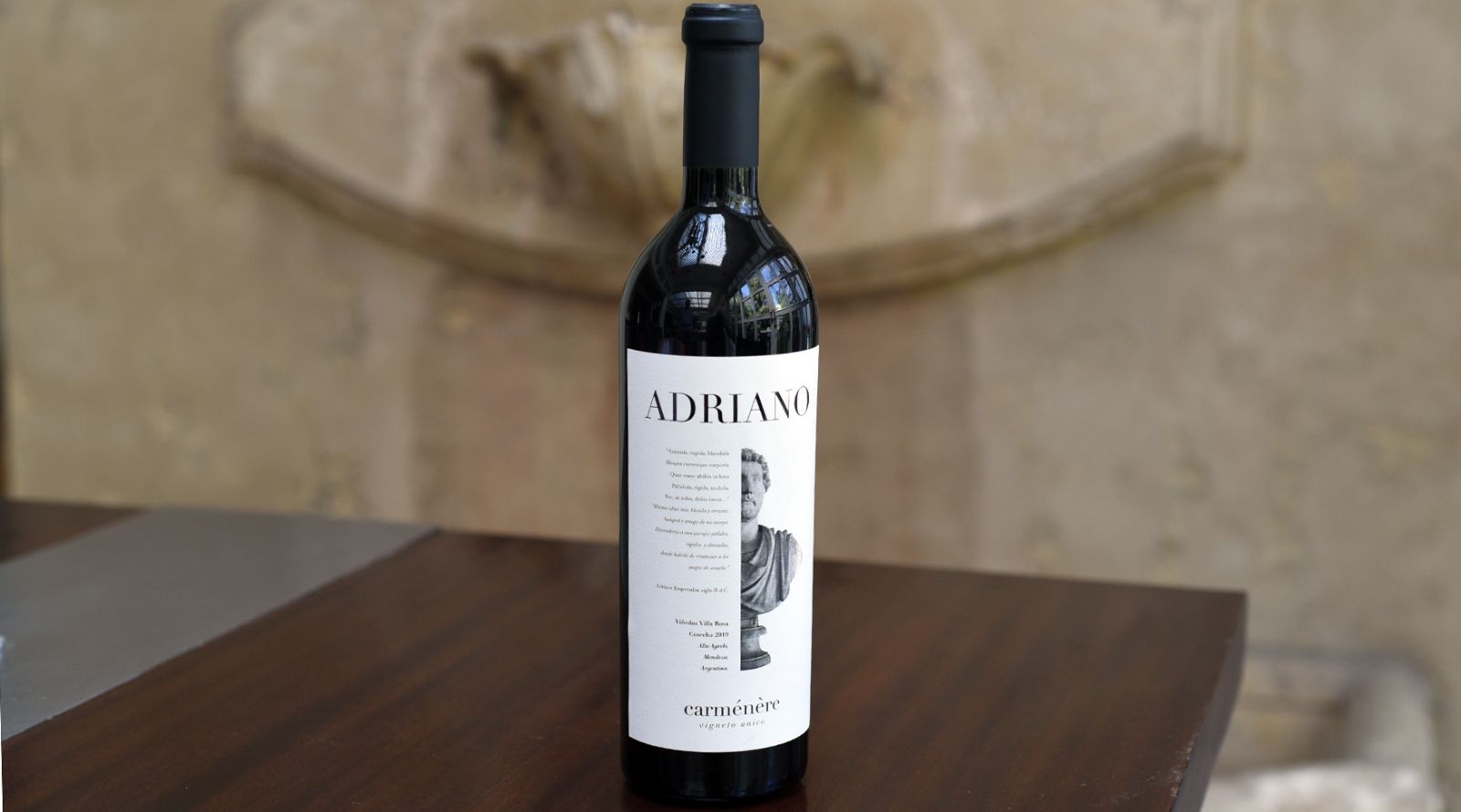 La botella es muy particular: sobria y al mismo tiempo importante. En la etiqueta vemos a un busto del emperador Adriano, en una suerte de paralelismo con su tocayo. Lo acompaña una cita del célebre monarca: "Mínima alma mía, blanda y errante, huésped y amiga de mi cuerpo. Descenderás a esos parajes pálidos, rígidos y desnudos, donde habrás de renunciar a los juegos de antaño". "Debo nombrar a Milagros Estornell Zunino, a José Ponce y a Cecilia Zunino, mi esposa, como los colaboradores directos de este proyecto", agrega.