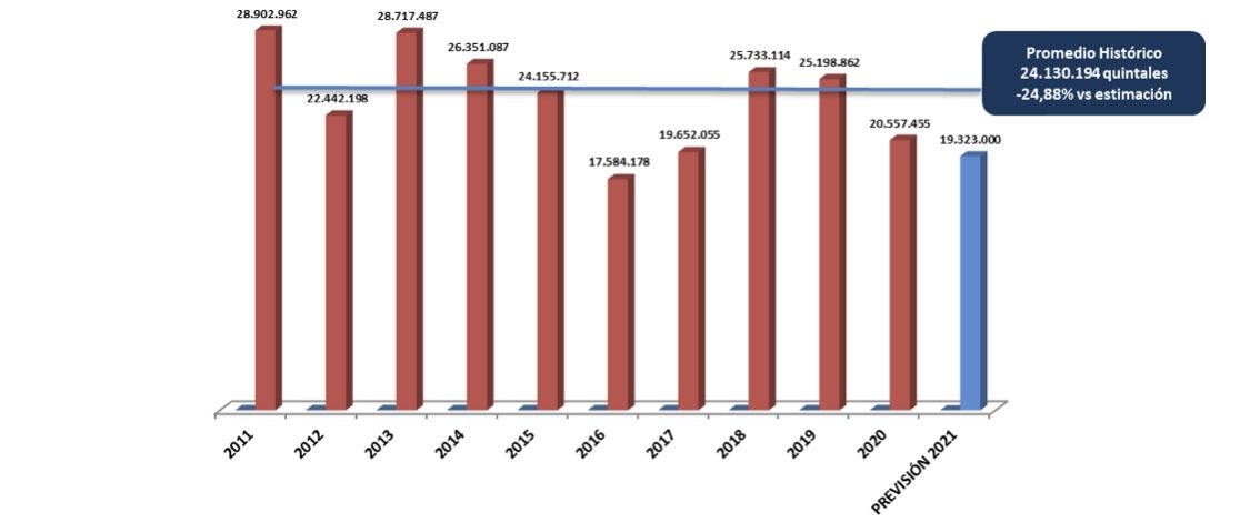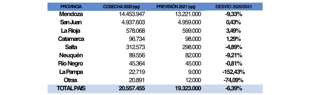 La cosecha total prevista de uvas para la Argentina se prevé en 19.323.000 quintales lo que implica una disminución del 6,39% respecto de la cosecha 2020, que fuera de 20.557.455. La previsión 2021 tiene un desvío estándar del 5%.