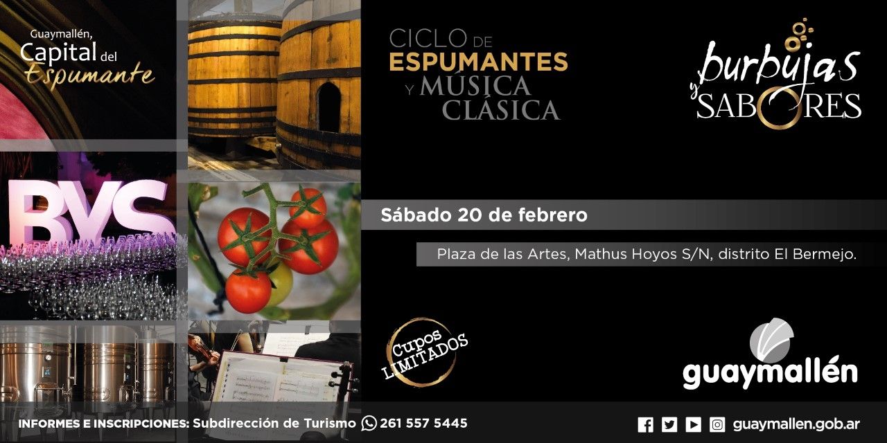 La edición 2021 de Burbujas y Sabores continúa en agenda. Este sábado 20 de febrero, Guaymallén invita a vivir el cuarto encuentro del ciclo de espumantes y música clásica, una experiencia vitivinícola, gastronómica y cultural imperdible. El evento se realizará en la Plaza de las Artes, ubicada en el distrito El Bermejo.