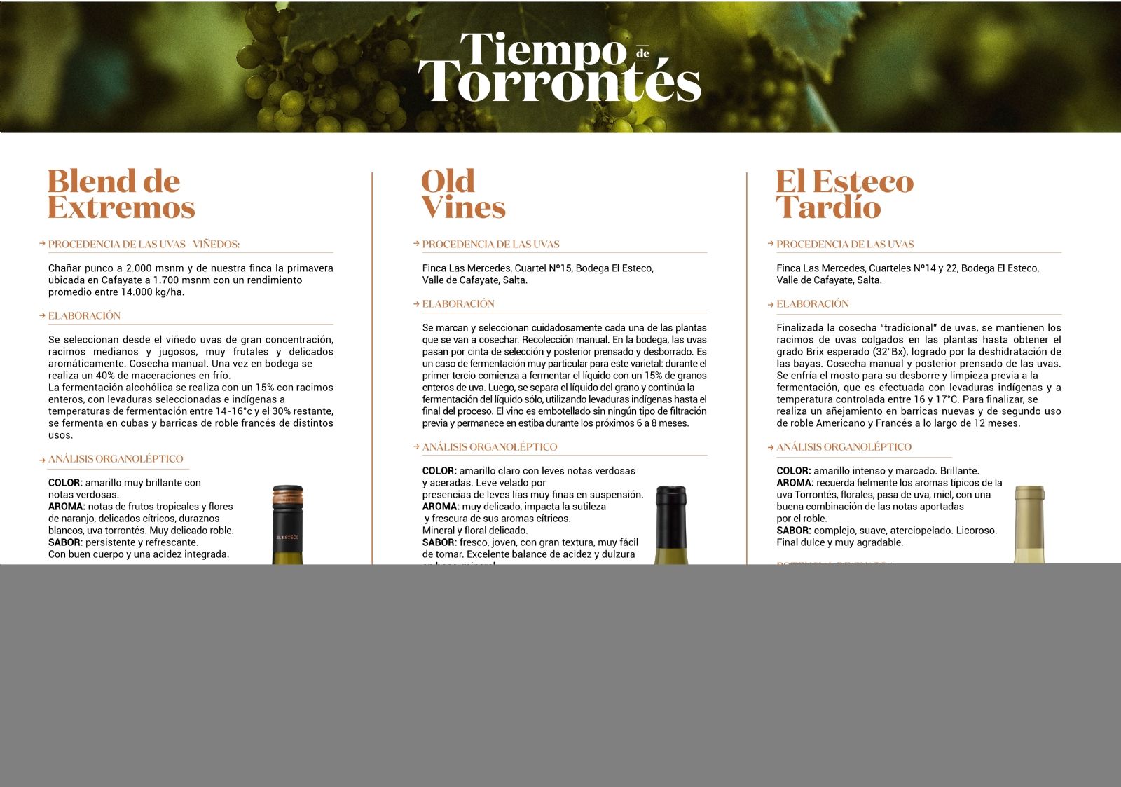 El Esteco Tardío como el Old Vines, también proviene de Finca Las Mercedes en Cafayate. Se obtiene de uvas recolectadas una vez finalizada la cosecha tradicional. Luego de deshidratadas las bayas, sigue un proceso artesanal que nos permite del típico aroma de de la uva torrontés, flores, pasa de uva y miel. Complejo, suave y aterciopelado, licoroso con un toque de roble que le otorgan un final dulce para dejar una larga sensación.