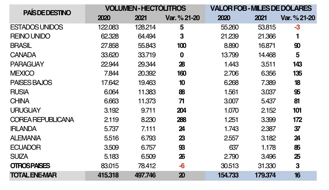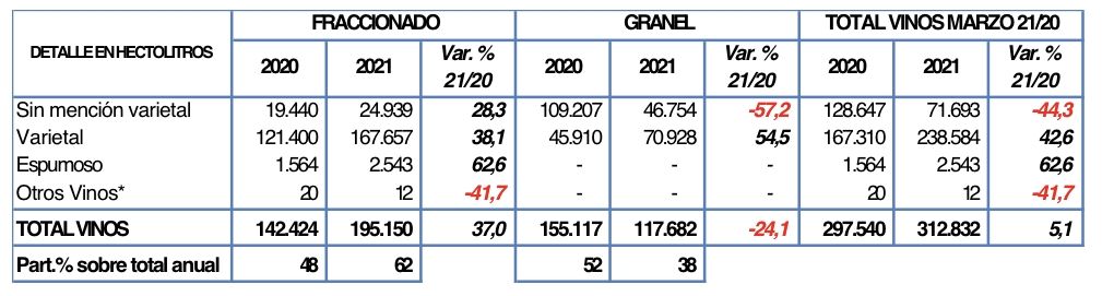 En particular las exportaciones de vinos fraccionados ya acumulan en el trimestre 2021 vs el 2020 un crecimiento en volumen del 20% y del 16% en valor FOB USD.
