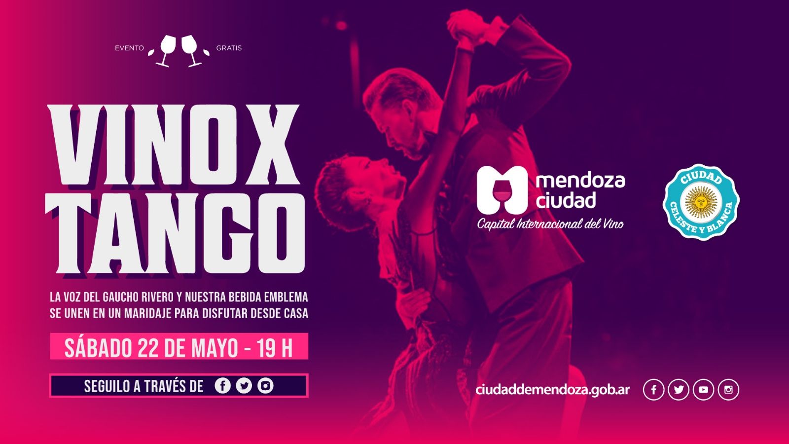 La agenda del vino continúa acercándose a los vecinos de la Capital con diferentes propuestas, esta vez, Vino x Tango en su versión online. El sábado 22 de mayo a las 19 horas, la muni te invita a disfrutar –desde la comodidad de tu hogar– de una copa del mejor Malbec mendocino para ser parte de un maravilloso momento.
