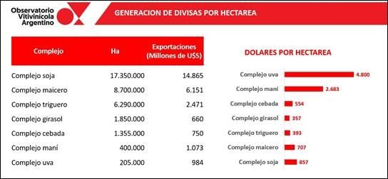 Según estos datos y con relación a la generación de divisas, una hectárea cultivada con uva genera exportaciones promedio por un total de U$S4.800. Esto es casi el doble de lo que exporta una hectárea de maní (U$S2.683) y representa 5,6 veces más de lo que la soja exporta por hectárea, que equivale a U$S857.